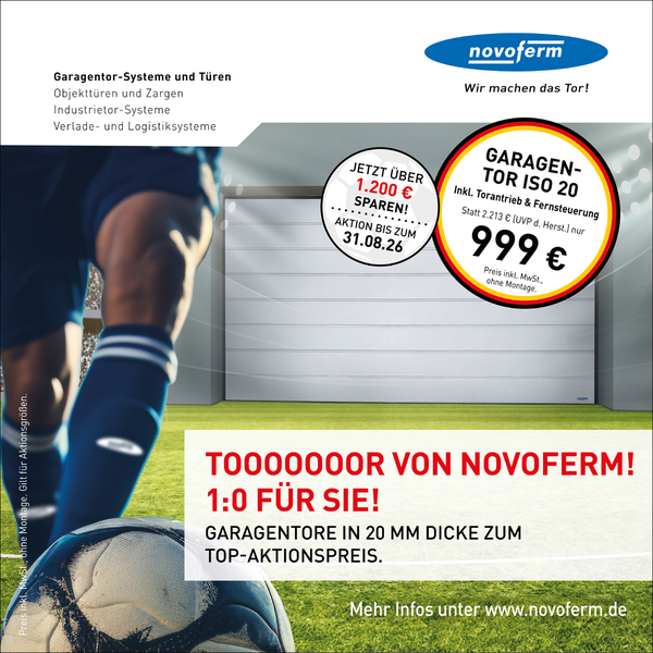 Novoferm eine einmalige Sonderaktion. Unter dem Begriff Mehr Komfort für mich- werden Garagen-Sektionaltore iso 20 in Verkehrsweiss zusammen mit dem patentierten Premium-Antriebssystem Novo-Port, einem Handsender und auf Wunsch gegen Aufpreis auch in 11 Supercolor-Farben zum unschlagbaren Sonderpreis angeboten. Dabei verbraucht der Antrieb im Standby-Betrieb nur 0,5 Watt pro Stunde und die Handsender können mit langlebigen und preisgünstigen Batterien betrieben werden. Alles in allem eine phantastische Möglichkeit alte unpraktische Schwingtore durch neue platz- und energiesparende Sektionaltore zu ersetzen und sowohl optisch, als auch energetisch neue Impulse zu setzen.